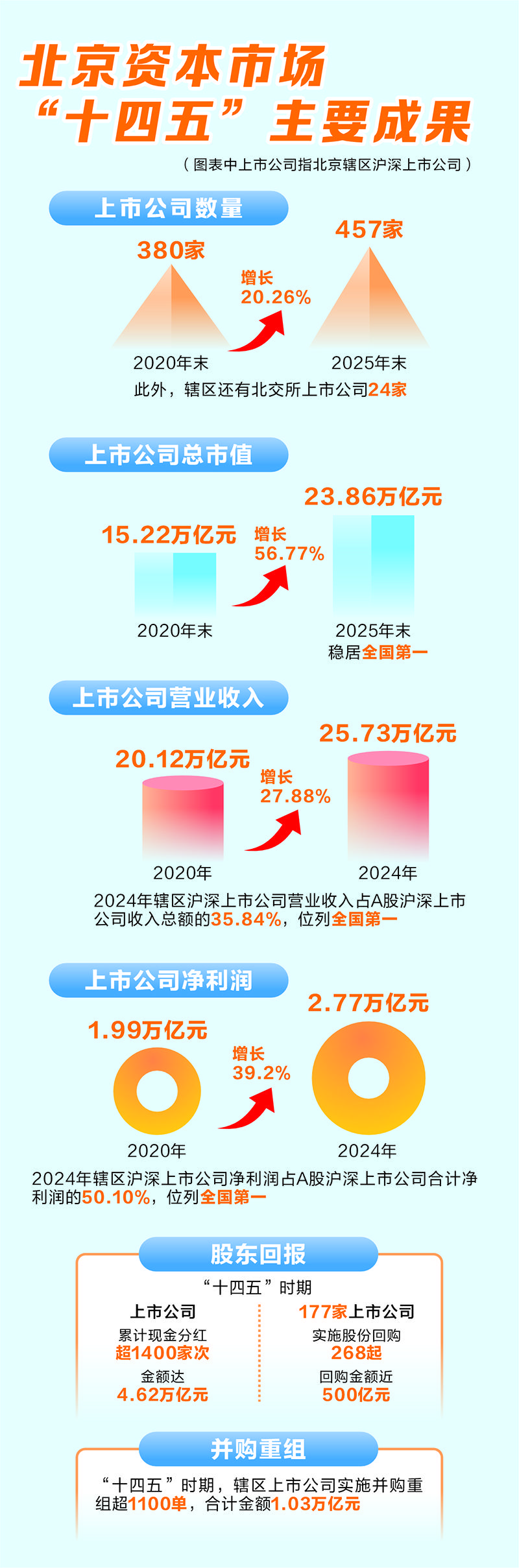 2024年辖区沪深上市公司营业收入及净利润分别占A股沪深上市公司总额的35.84%和50.10%,位列全国第一;研发费用较2020年大幅增长57.14%,位居全国创新的“第一梯队”;“十四五”时期,辖区企业实现直接融资超6万亿元,居全国首位;累计发行各类债券4.74万亿元,7969.44亿元交易所科创债精准支持科技创新;辖区A股公司以23.86万亿元总市值稳居全国第一;累计现金分红超1400家次,金额达4.62万亿元……这是证券时报记者从北京证监局获得的数据。